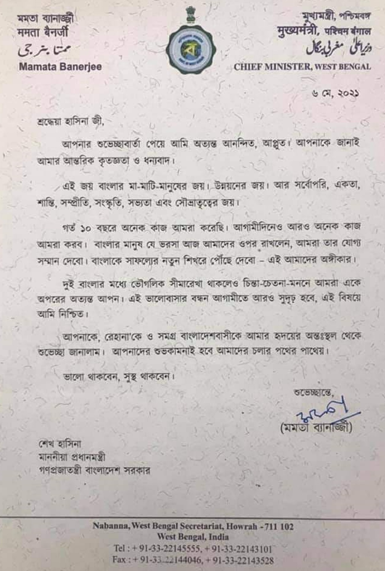 প্রধানমন্ত্রীর শুভেচ্ছাবার্তার উত্তরে পশ্চিমবঙ্গের মুখ্যমন্ত্রীর ধন্যবাদপত্র